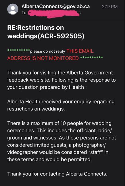 With the new restrictions for Alberta that became effective yesterday, it states the max number doesn’t include staff or people who are not considered an invited guest. Would you say photographers, videographers, and ceremony DJ’s would be in this...